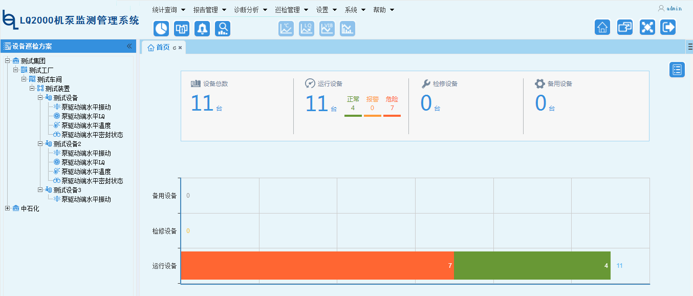 上位機分析軟件具有振動波形頻譜分析、趨勢查詢、報警查詢、設備運行狀態查詢、設備數據統計報告、診斷報告編寫、巡檢計劃編制、設備管理功能。